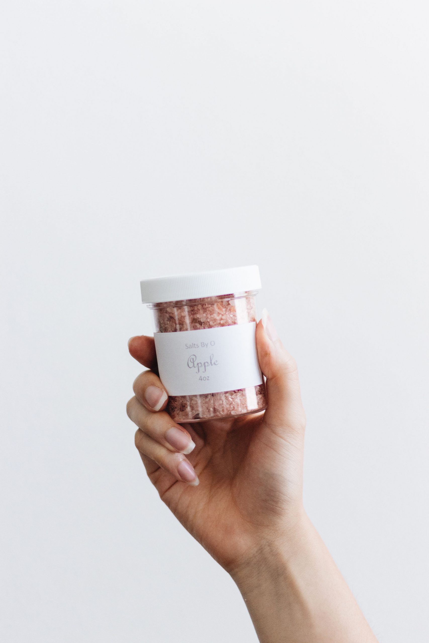 Ingredients: Epsom Salt, Pink Himalayan Sea Salt, Apple Fragrance Oil, and Cherry Red Powdered Pigments.