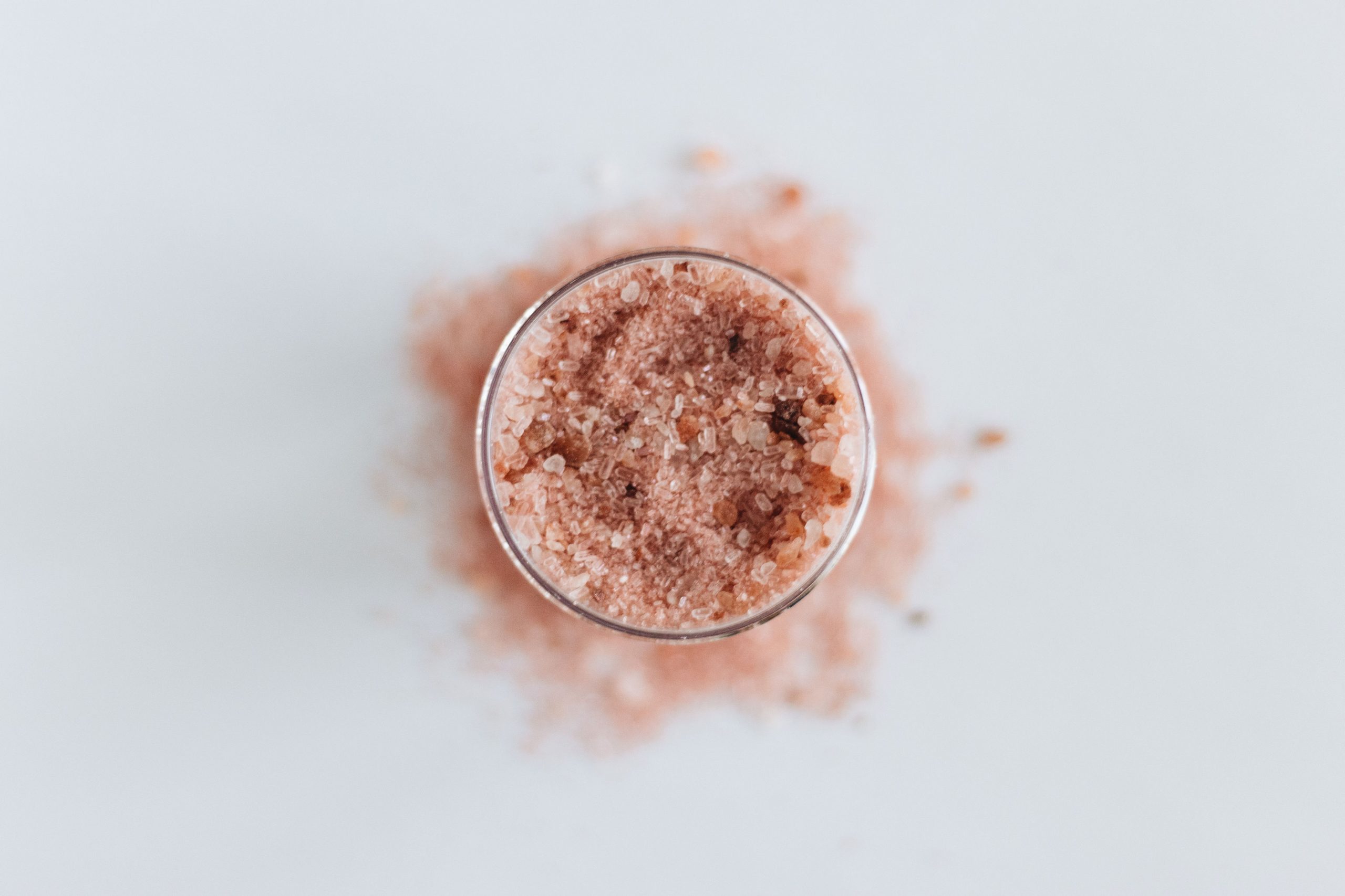 A jar of our bath salt soak formula with the scent of grapefruit, colored a shimmering pink.