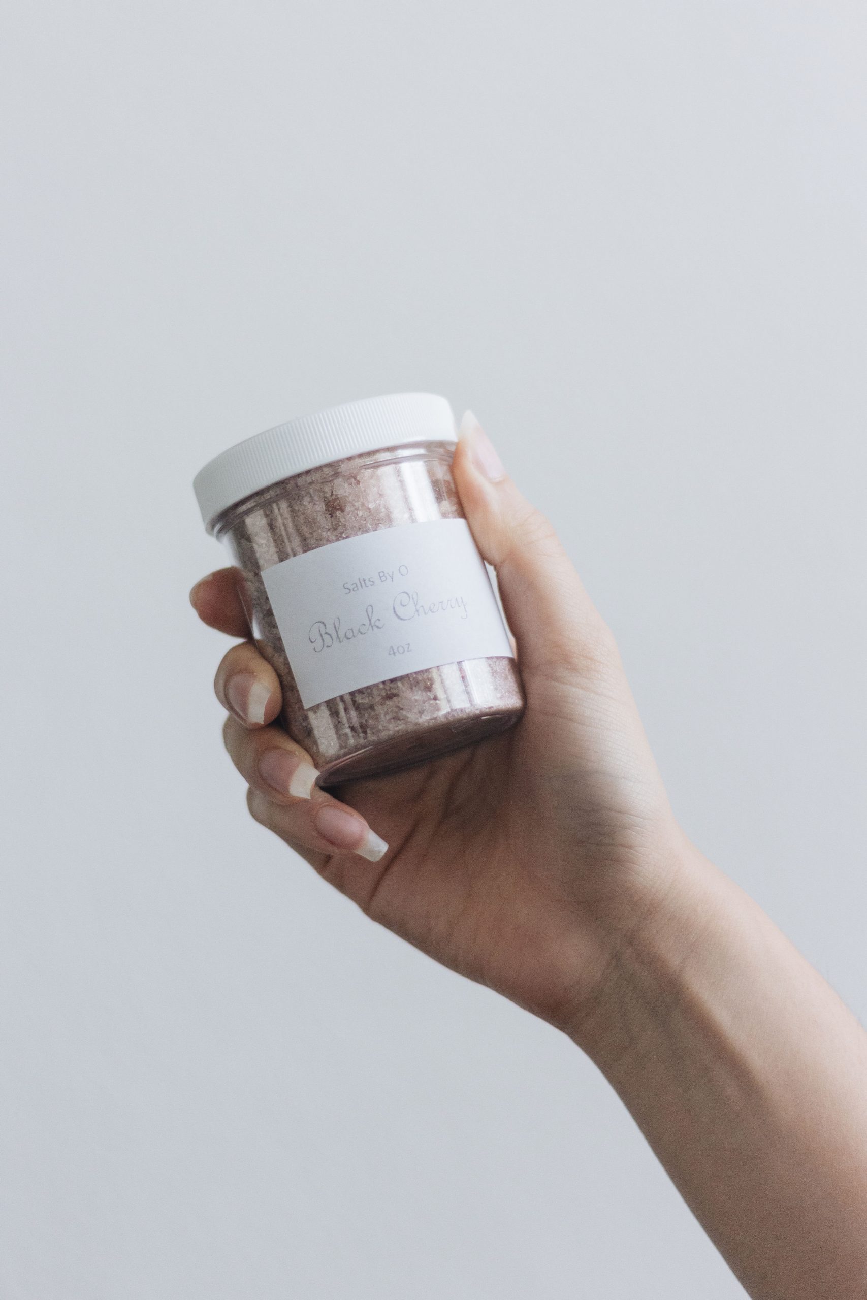 A jar of our bath salt soak formula with the scent of black cherry, colored a shimmering Black.