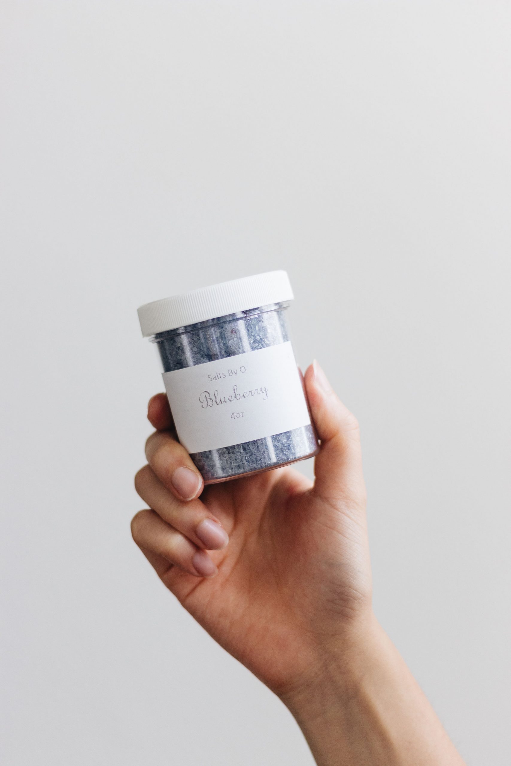 Ingredients: Epsom Salt, Pink Himalayan Sea Salt, Blueberry Fragrance Oil, and Classic Blue and Miltonia Powdered Pigments.