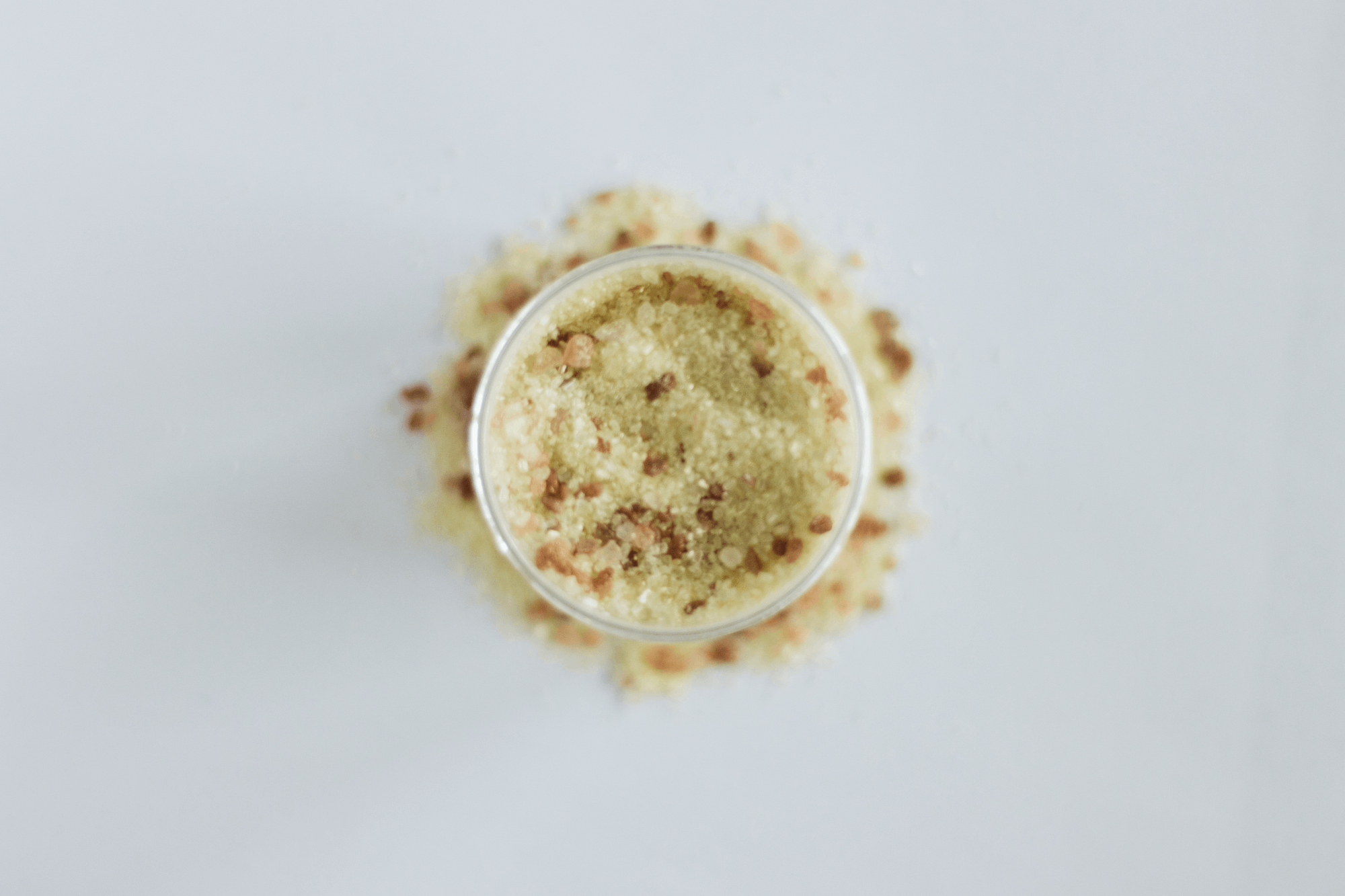 A jar of our bath salt soak formula with the scent of lemon, colored a shimmering yellow.