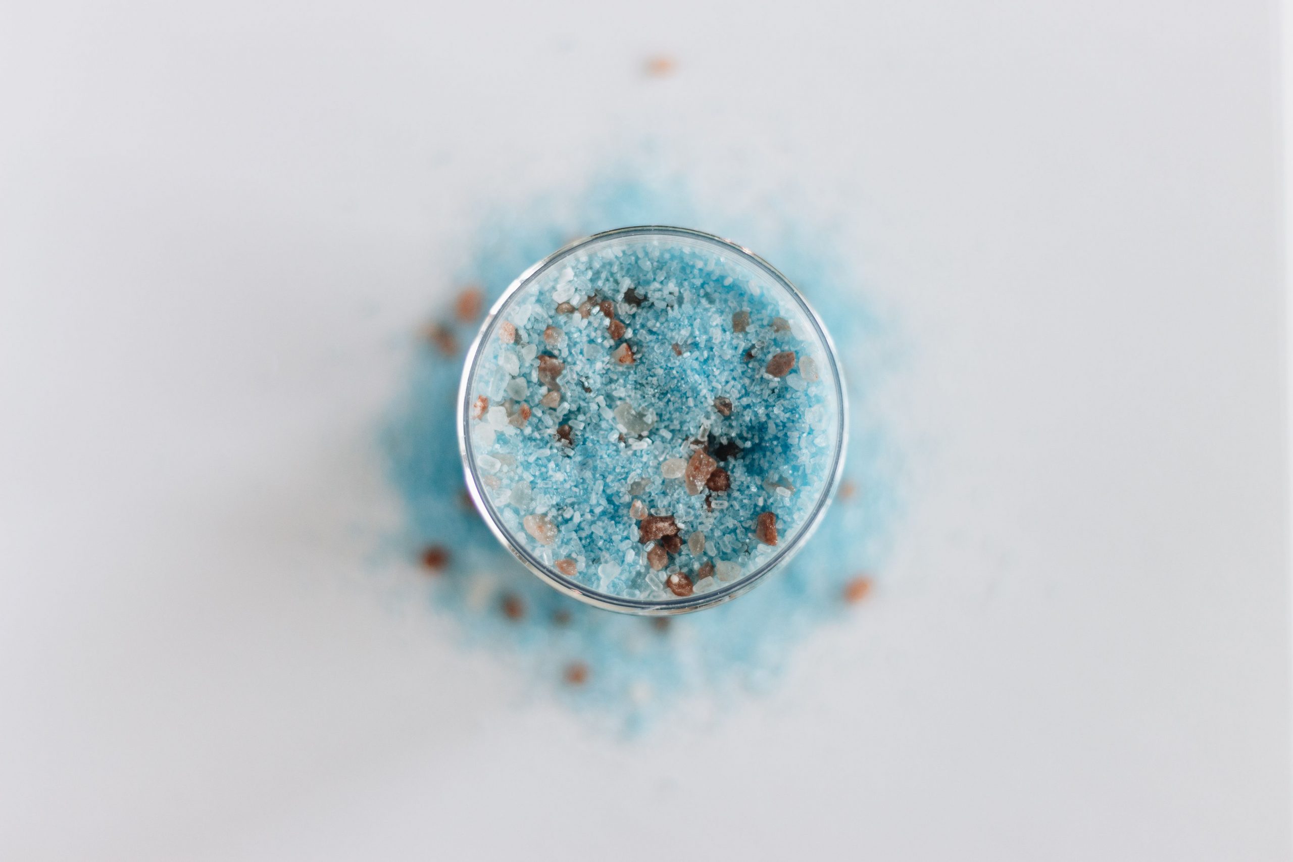 A jar of our bath salt soak formula with the scent of rain, colored a shimmering blue.